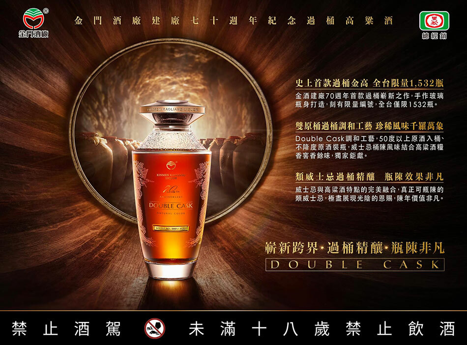 Double Cask調和工藝,50度以上原酒入桶、不降度原酒裝瓶,威士忌桶陳風味結合高粱酒糧香窖香餘味,獨家鉅獻。—>絕對好喝(!)