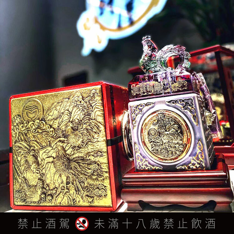 本產品乃金門 酒廠2016年首度發行的系列性的十二生肖玉璽酒之一,玉璽代表著一國領導者行使權利的權杖,有著至高無上的權力與無比尊貴之特質,鑒此,金門酒廠特別精 心結合中國十二生肖推出開運商品。雞,在十二生肖中排名第十,十有著團圓圓滿之意,雞為人類最早飼養的家禽,能為人們提供溫飽、守夜報曉,在閩南語喻為 「起家」,又含意著勤勞真懇,旭日東昇,為希望充滿正向力量的象徵,2017丁酉雞年-玉璽酒以「金雞報喜」為整體概念,將琉璃與陶瓷相映成器推出精緻商品。